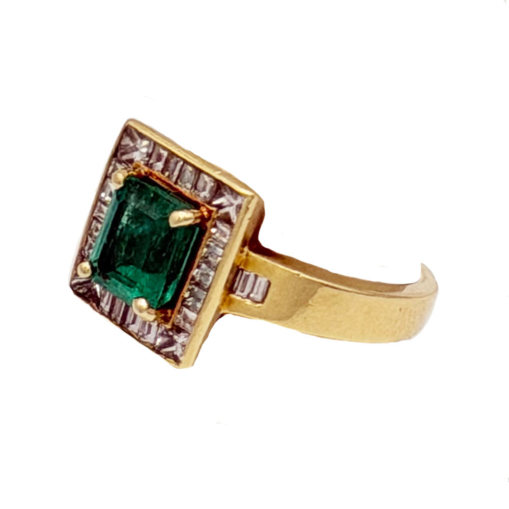 18K yellow gold ring with a beautiful rectangle shape emerald in the middle surrounded by square and baguette shape diamonds, Along the shoulder of the ring there are two more baguettes. The ring is in Great condition.