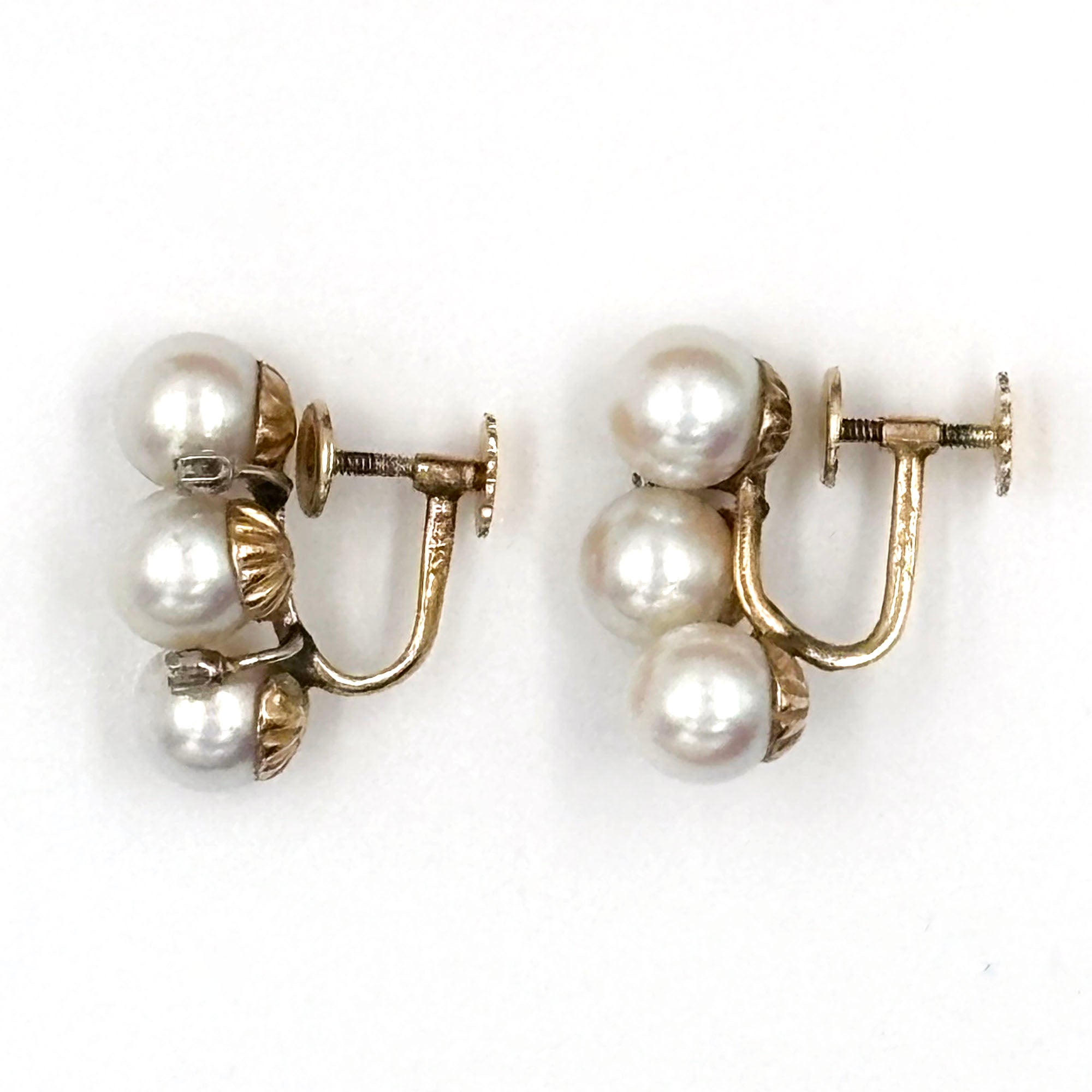 Vintage circa 1950's 14k Yellow gold triple akoya pearl diamond screw back earrings, in excellent condition.
