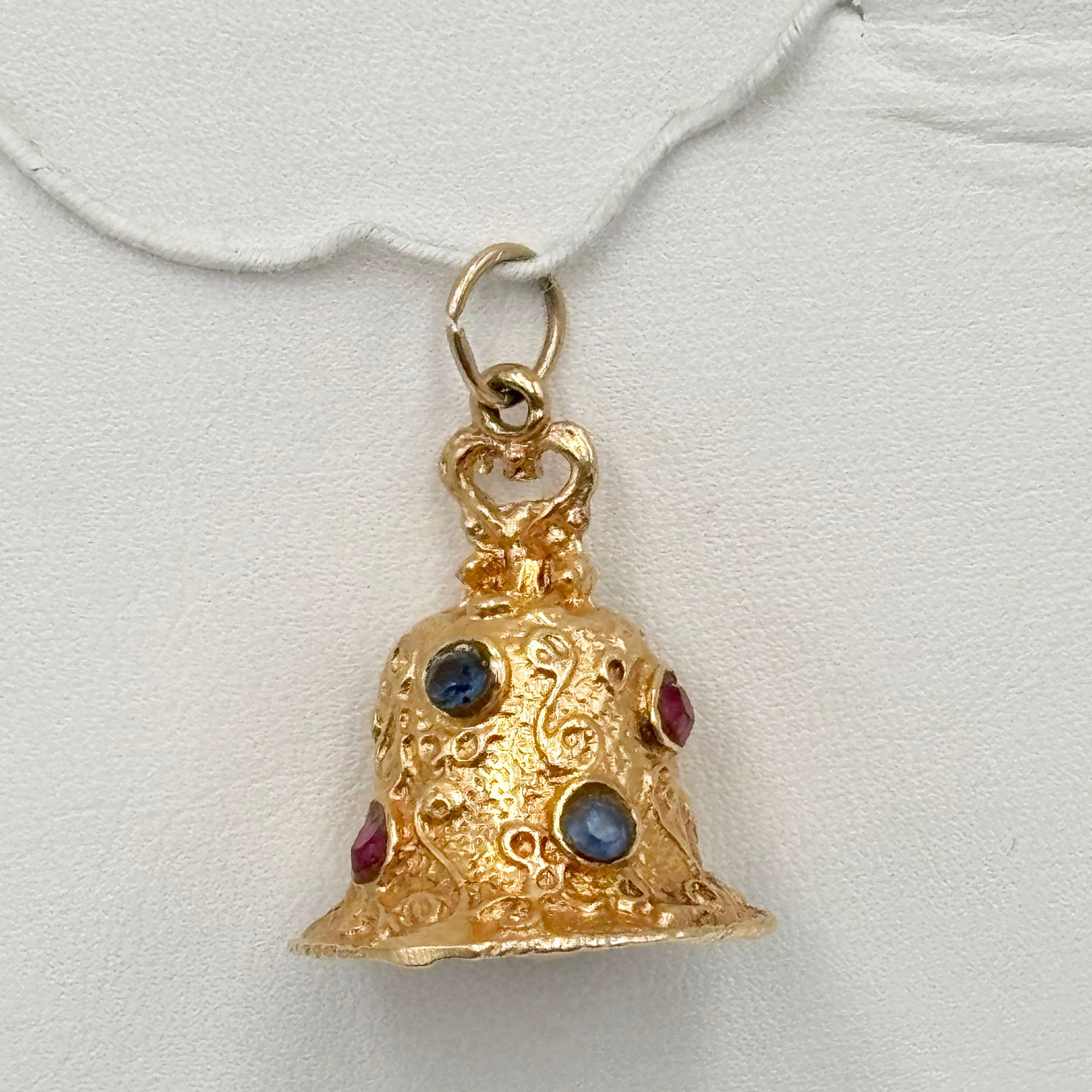 14K Yellow gold bell charm with pearl on the inside and synthetic ruby and synthetic sapphires on the outside of bell, in excellent condition